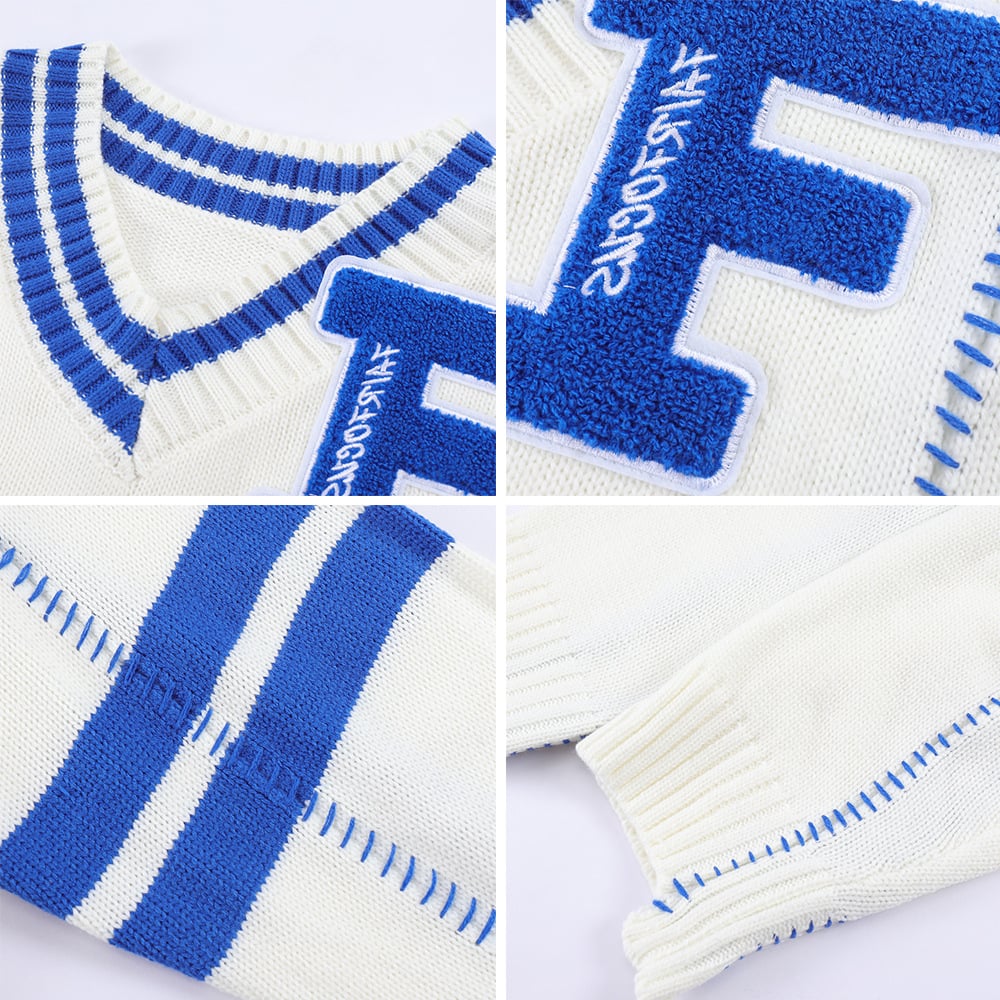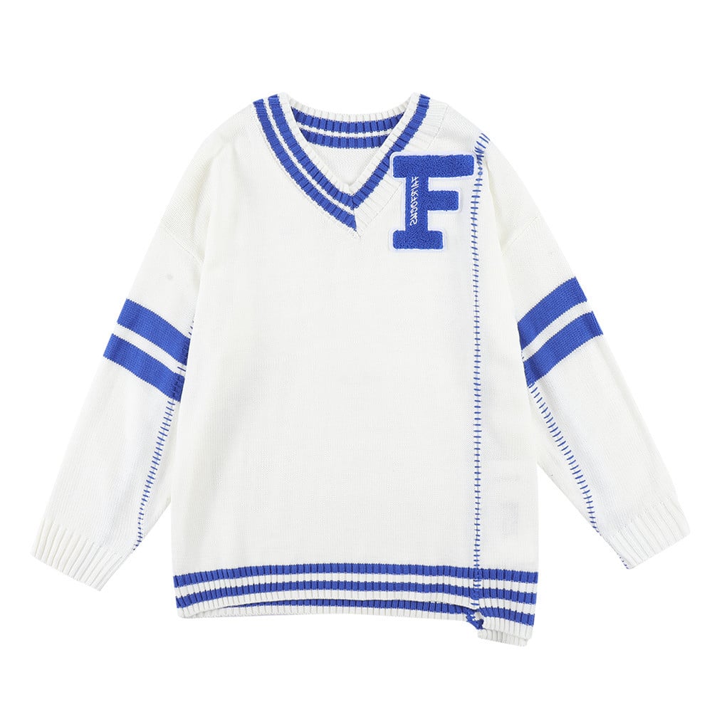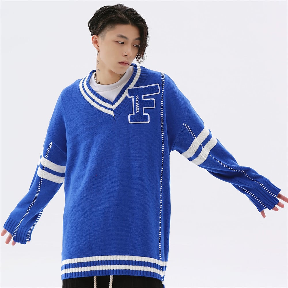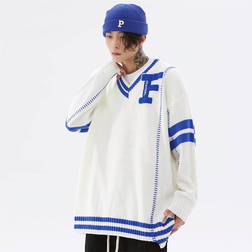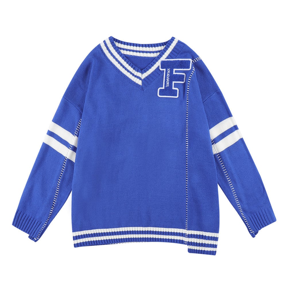 Don’t miss out on this opportunity to redefine your style with our Colorblock Letter Embroidery V-Neck Personality Pullover Sweater. Grab yours today!